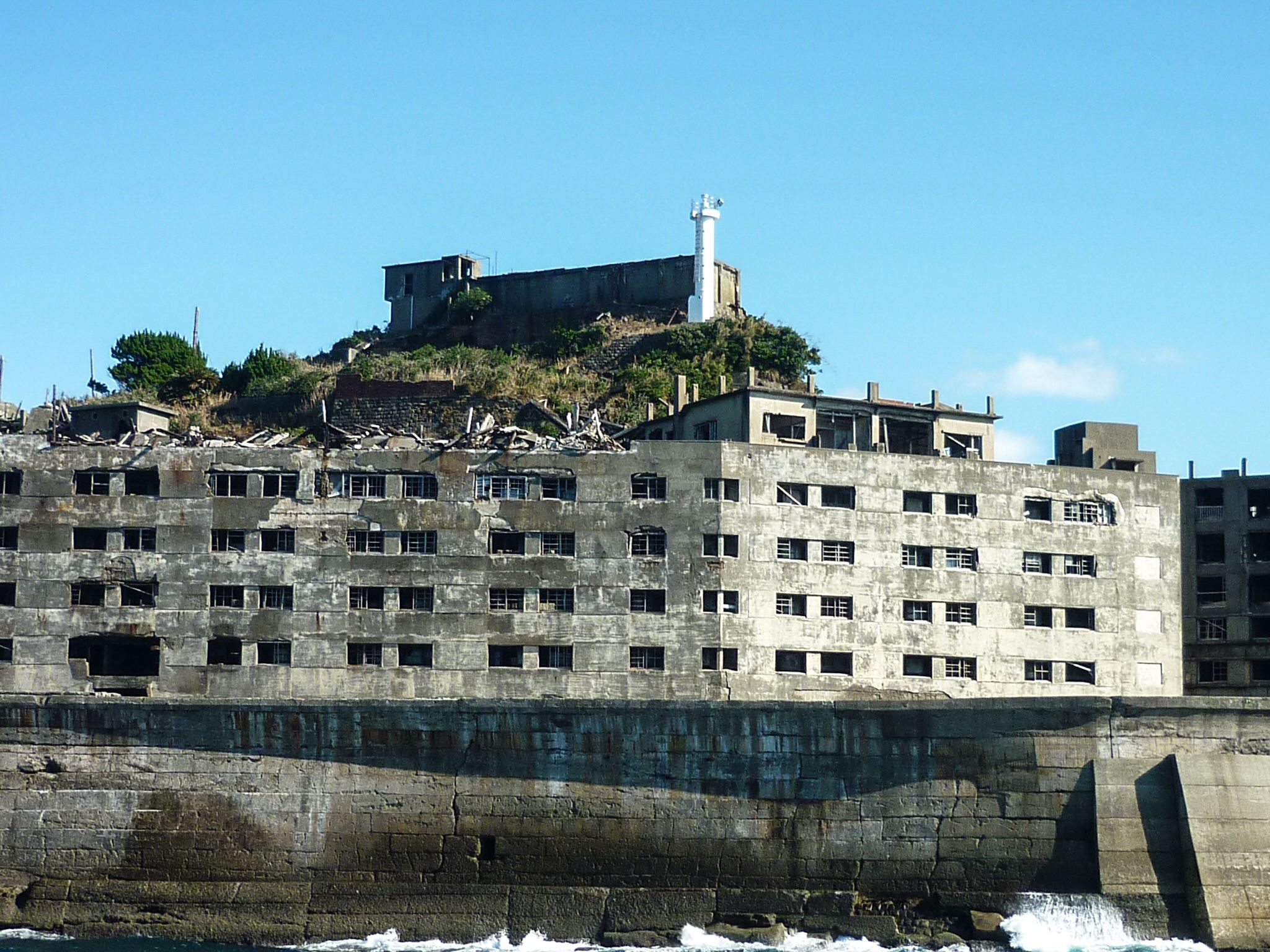 無人となったかつての住居アパートが立ち並ぶ。高台には灯台が建つ。