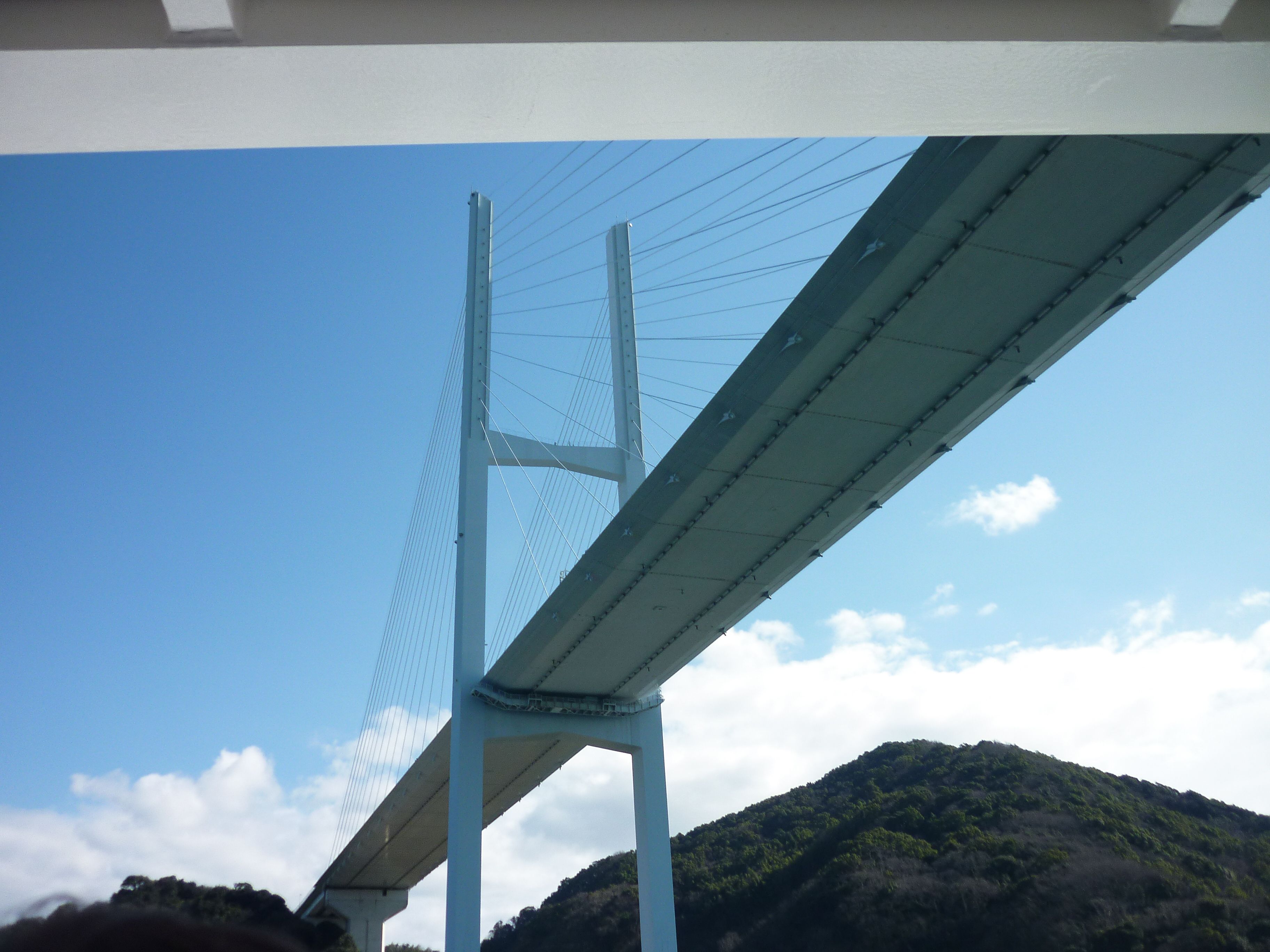 水面から非常に高い場所を人や車が通行する斜張橋の形式で、世界最大級の客船も通過できるようになっている。