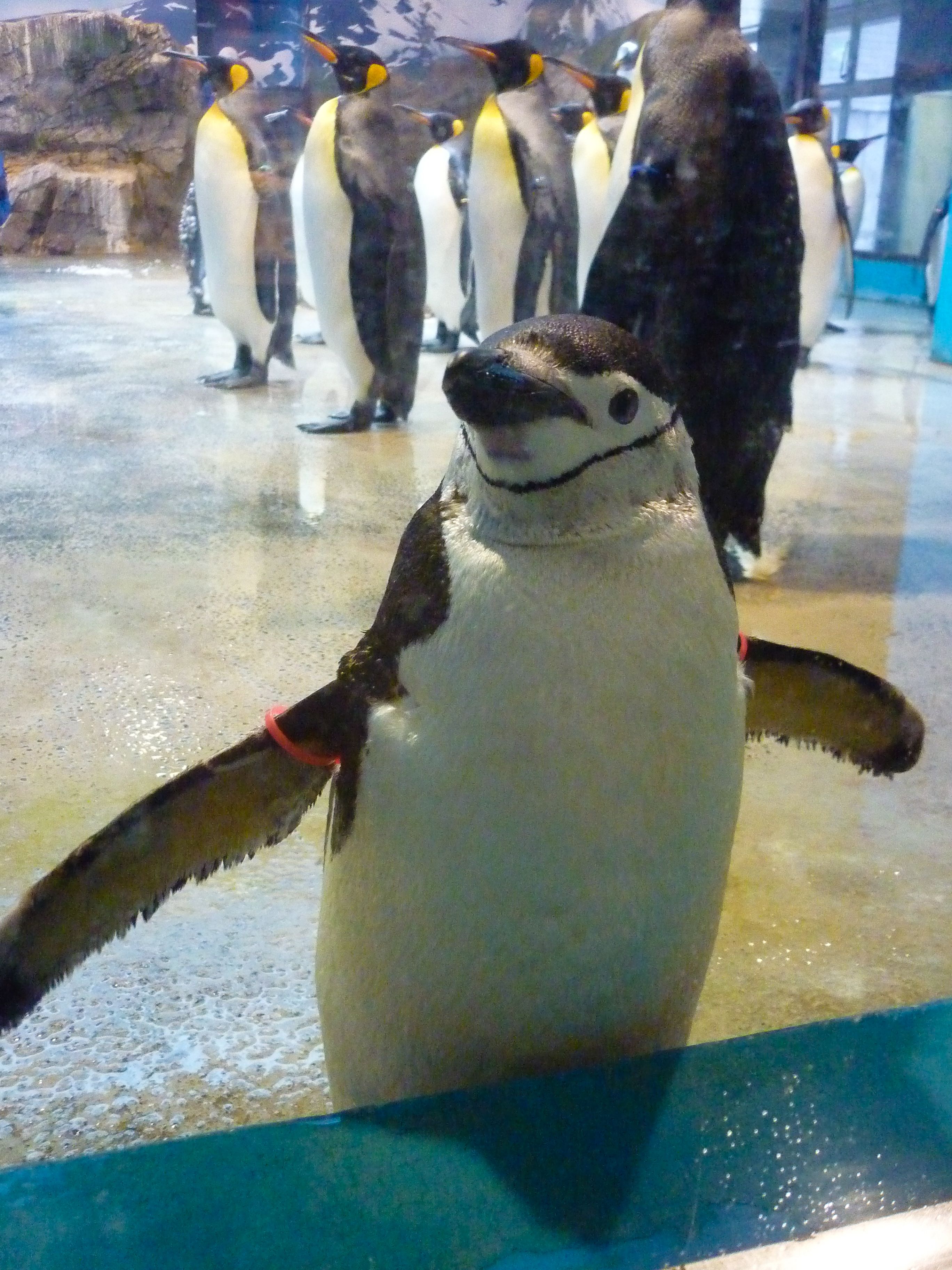 写真の彼は「ヒゲペンギン」、体長約70cm、体重約3.7~5.0kg。後ろは「キングペンギン」。