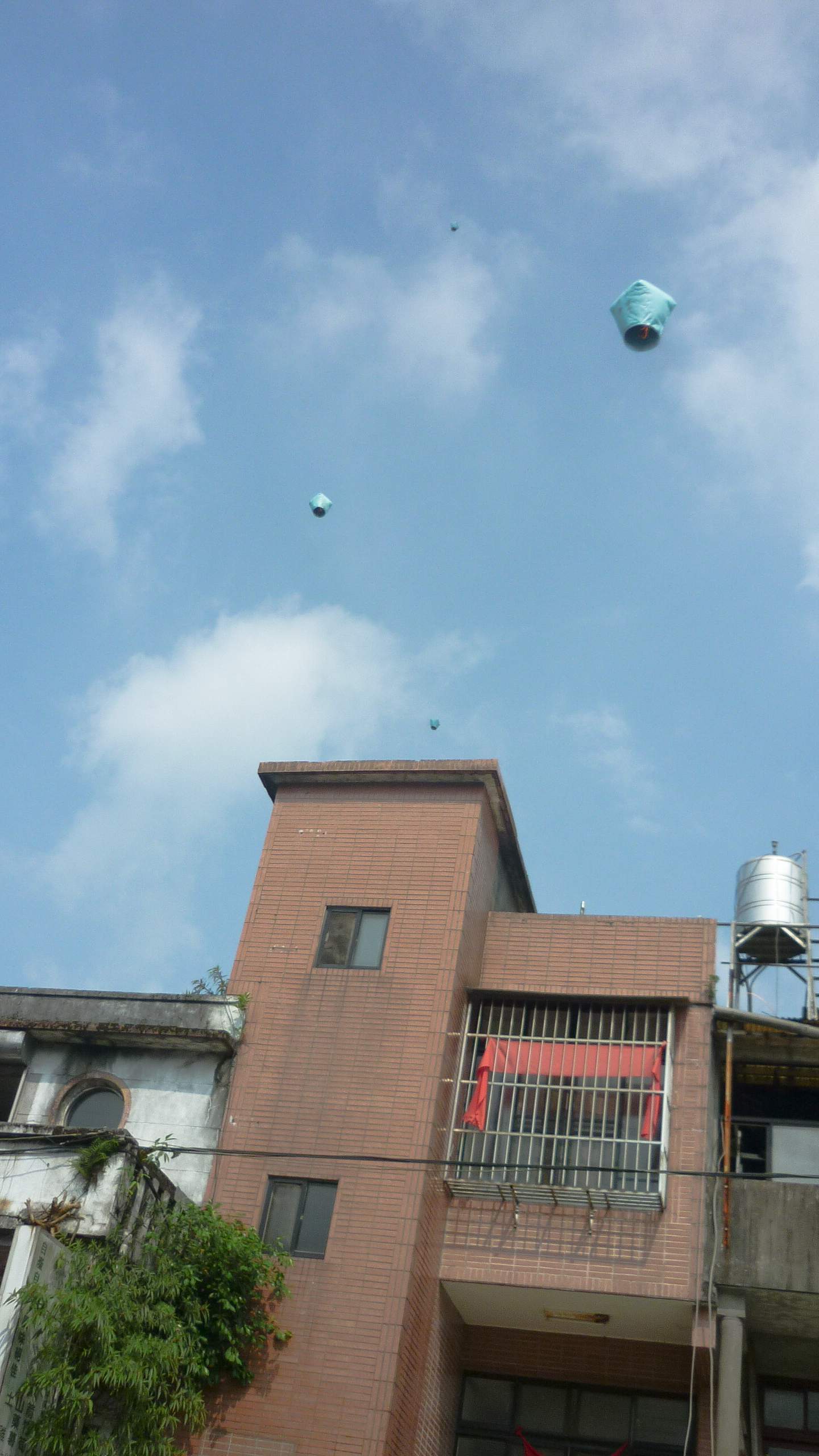 線路のすぐ近くに商店が立ち並ぶ。ランタン飛ばし体験もできる。