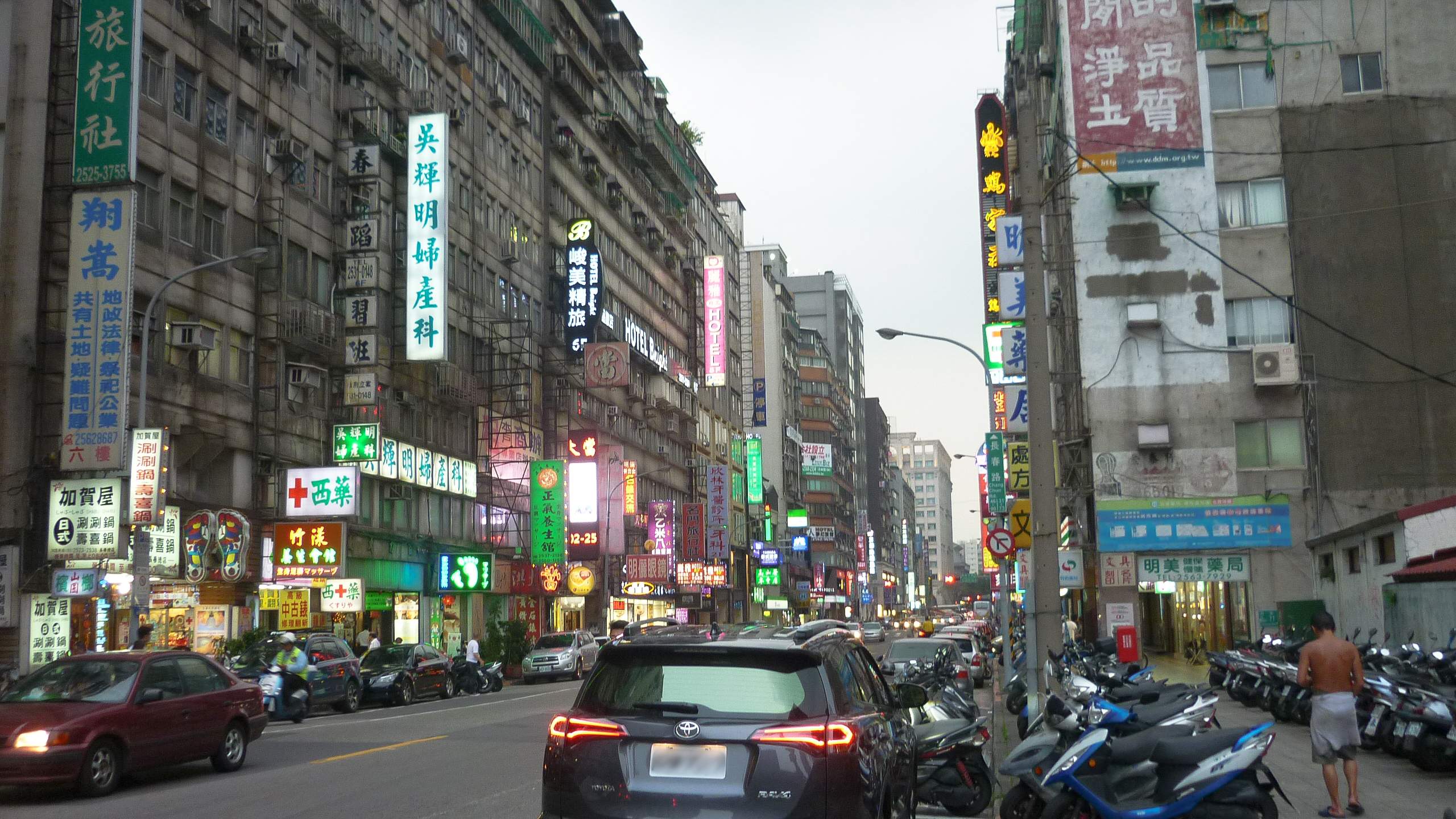 夕方の台湾台北市内。看板には色とりどりのネオンが光る。 ダウンロードする|Download 画像サイズ:2560 x 1440px、482.7 KB