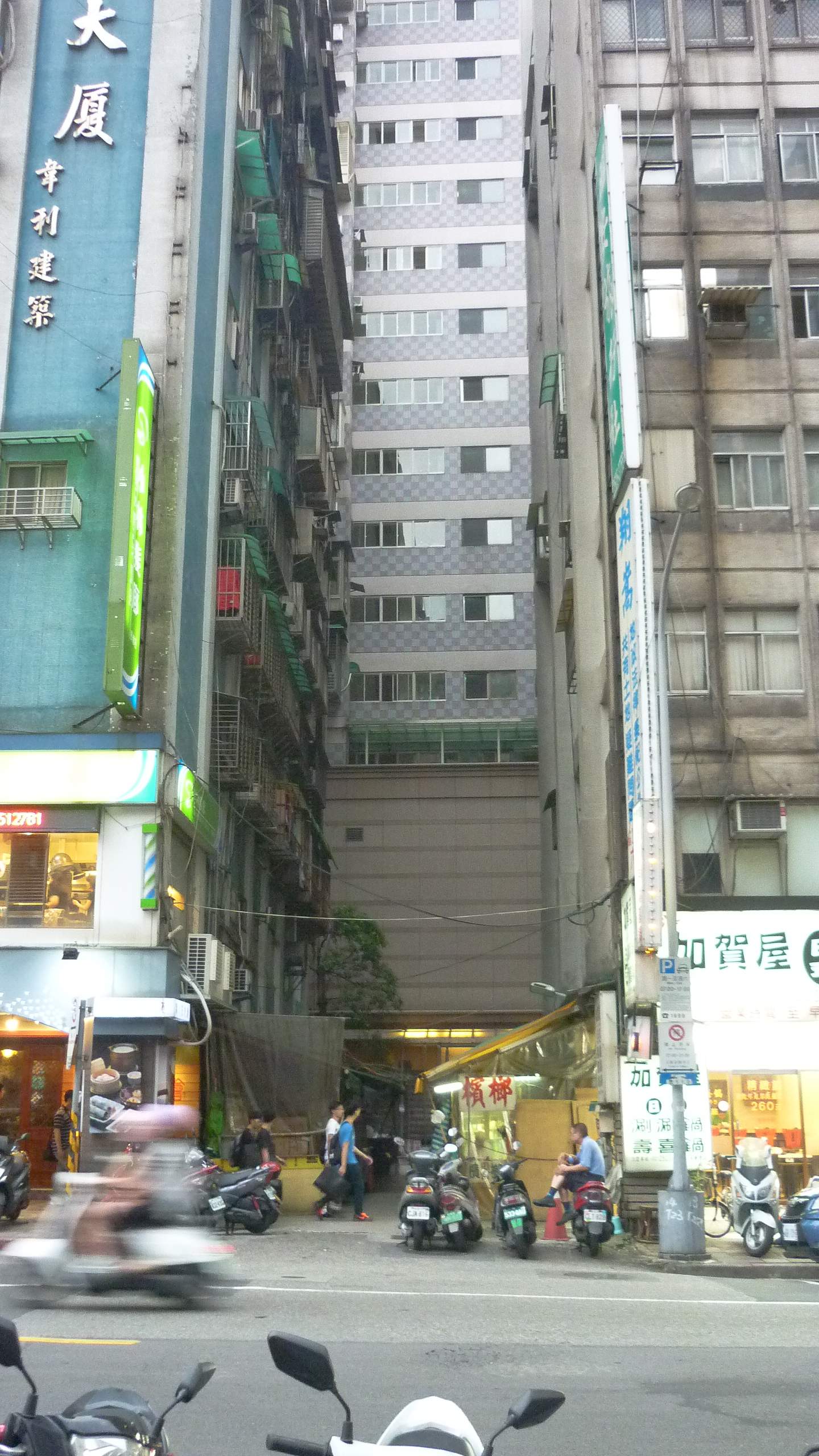 夕方の台湾台北市内。看板には色とりどりのネオンが光る。