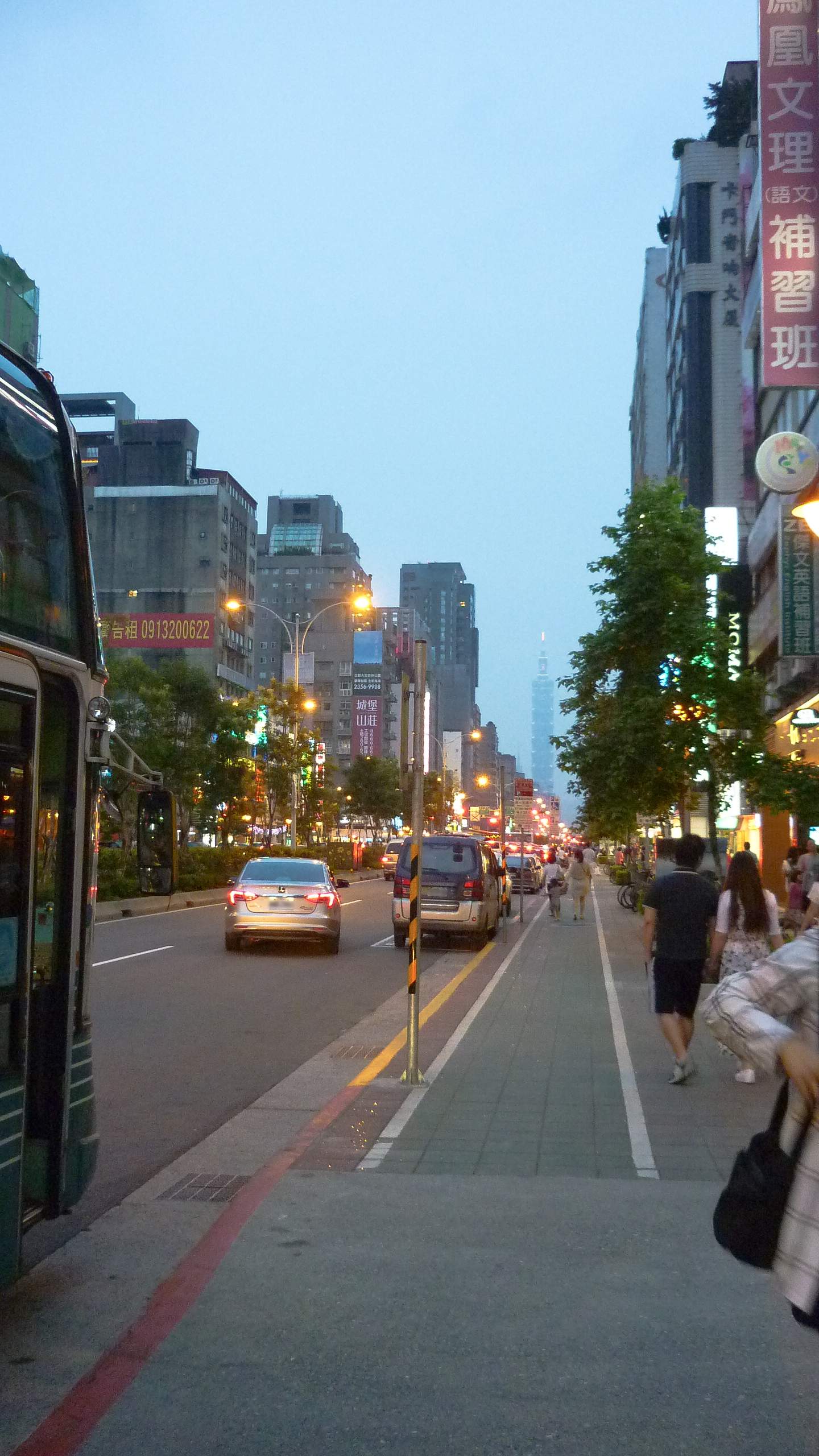 夕方の台湾台北市内。看板には色とりどりのネオンが光る。