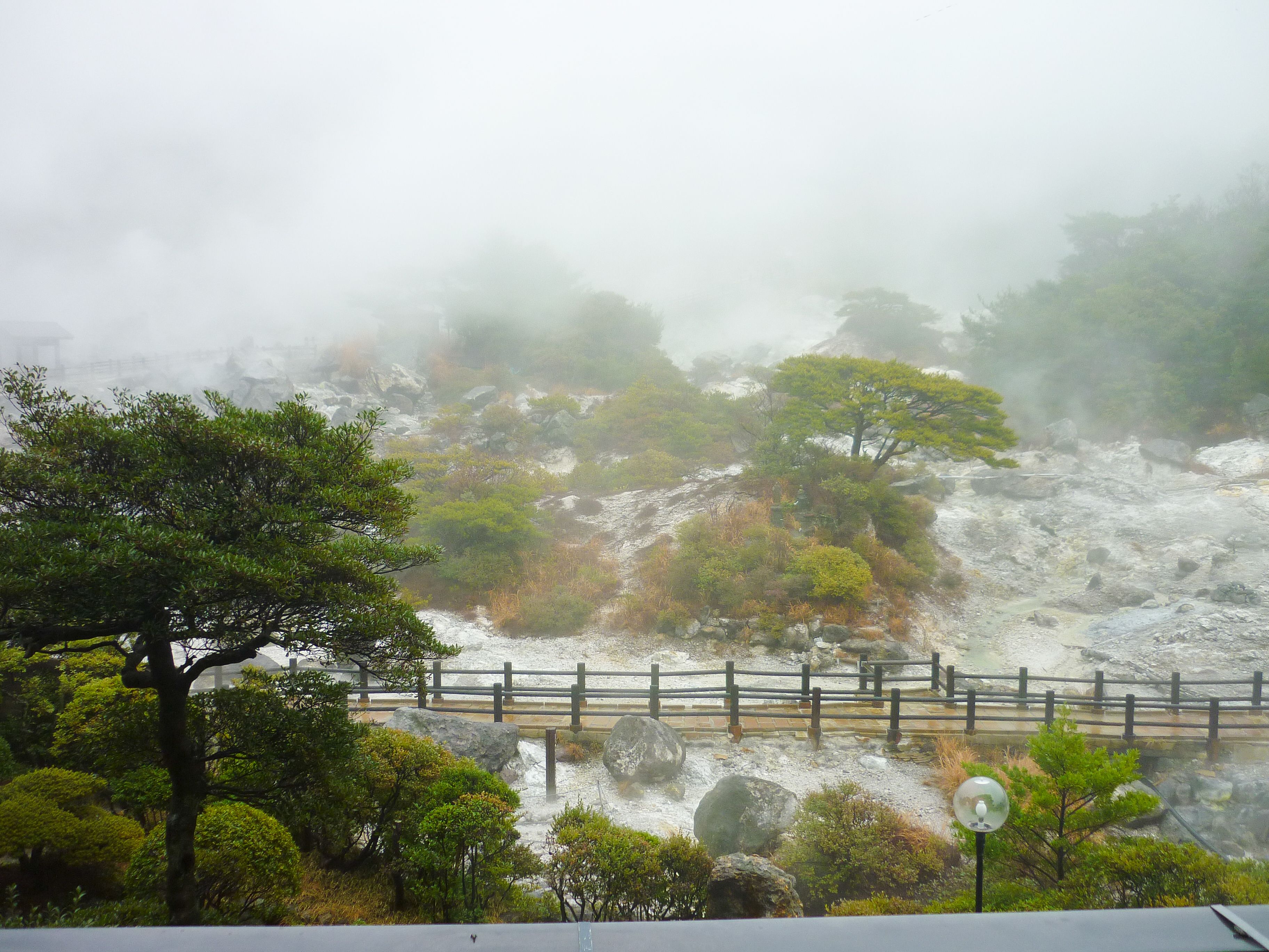 白い煙と硫黄の臭いが周囲に立ち込める不思議な光景。側にはキリシタン殉教碑もある。